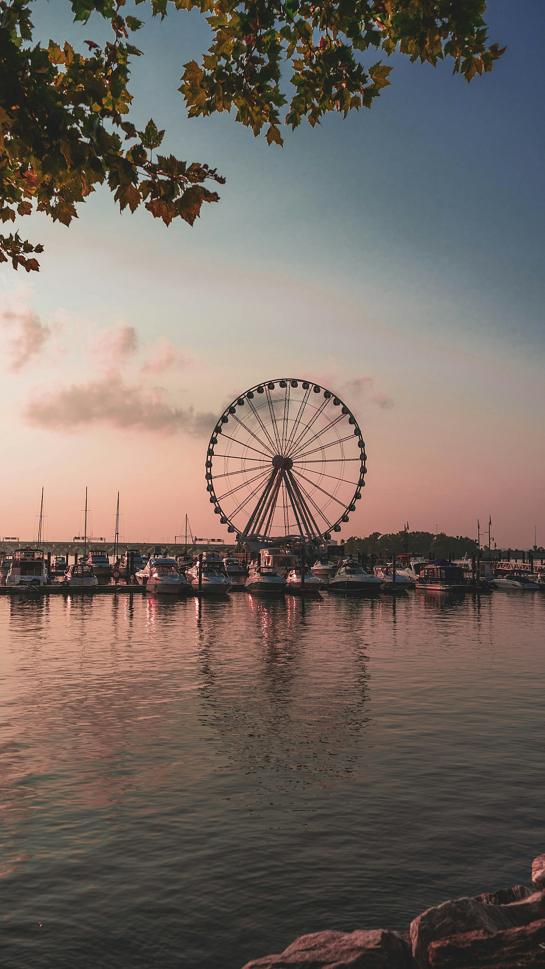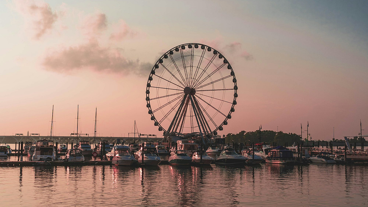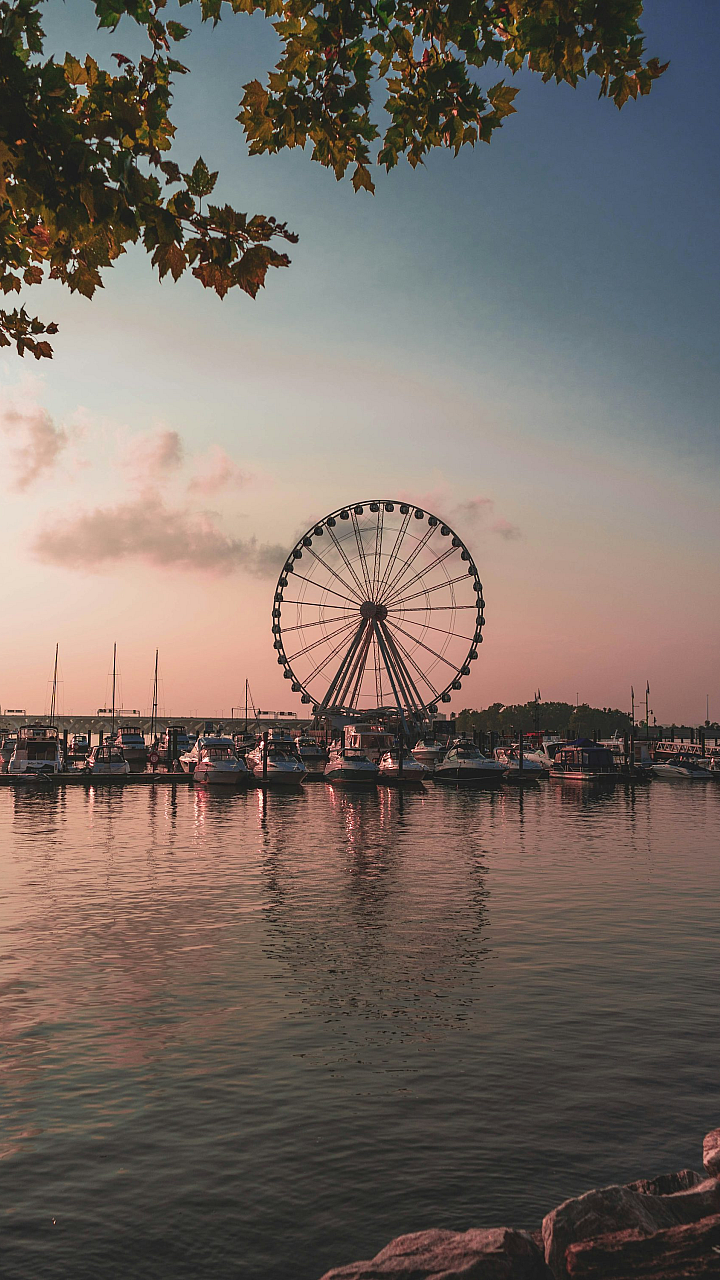 Wallpaper ini menampilkan pemandangan indah sebuah bianglala yang berdiri megah di dekat badan air, mungkin sebuah laut atau danau, pada siang hari. Cahaya matahari menerangi bianglala dan permukaan air, menciptakan suasana cerah dan damai. Warna-warna yang cerah dan kontras antara bianglala, air, dan langit membuat wallpaper ini sangat menarik dan cocok untuk mempercantik tampilan perangkat Anda. Gambar ini menangkap momen tenang dan menyenangkan, sempurna untuk siapa saja yang menyukai pemandangan pantai atau suasana taman hiburan.