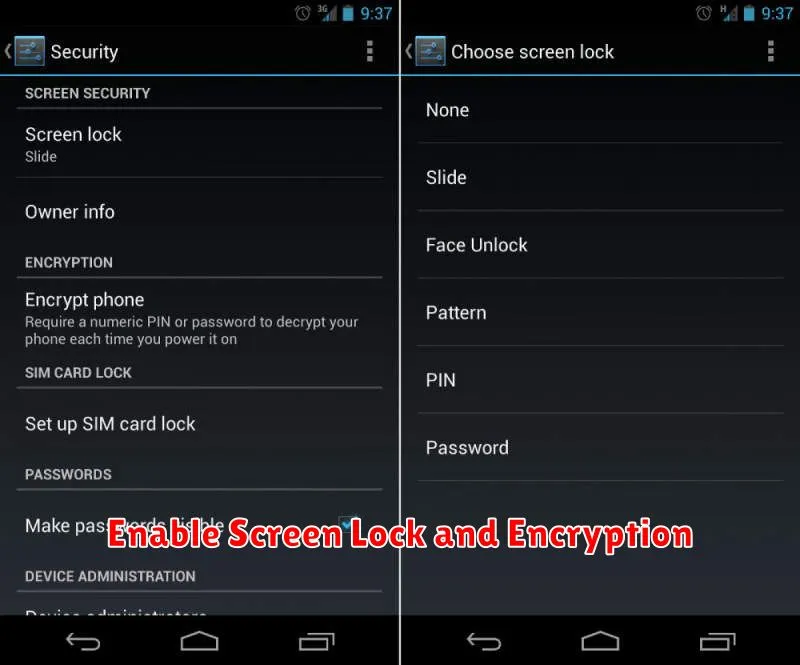 A screen lock is the first line of defense against unauthorized access to your device. Android offers various lock screen options, from simple patterns and PINs to more secure methods like passwords and biometric authentication (fingerprint, face recognition). Choosing a strong screen lock is crucial.